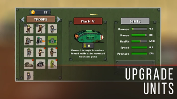 This 1917 trench assault warfare offers you epic defense gameplay with awesome pixel game graphics and sound effects, giving you an immersive experience of real world war trenches of British, German, and French Regimes.