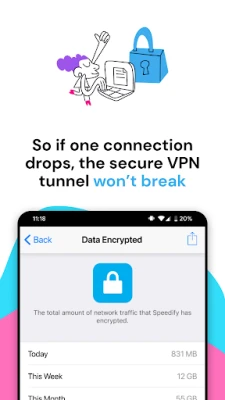 Speedify’s bonding makes sure a connection drop won’t break the VPN tunnel. Speedify’s VPN uses accelerated encryption from your device’s processors to deliver a fast, secure encryption for ALL of your apps, so you stay safe while you're browsing, shopping, or livestreaming.