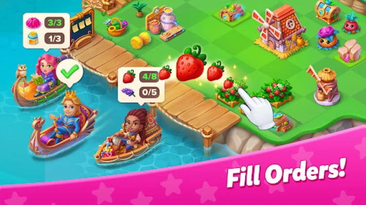 • Merge three items to get more powerful ones: turn seedlings into garden plants, farm houses into mansions!