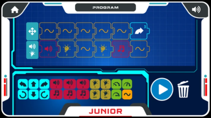 You control Juniors’s movements and sounds. Have fun and drive Junior by remote control or by using your device as a gyroscope. Code programs for Junior using an easy, visual interface included in the app.